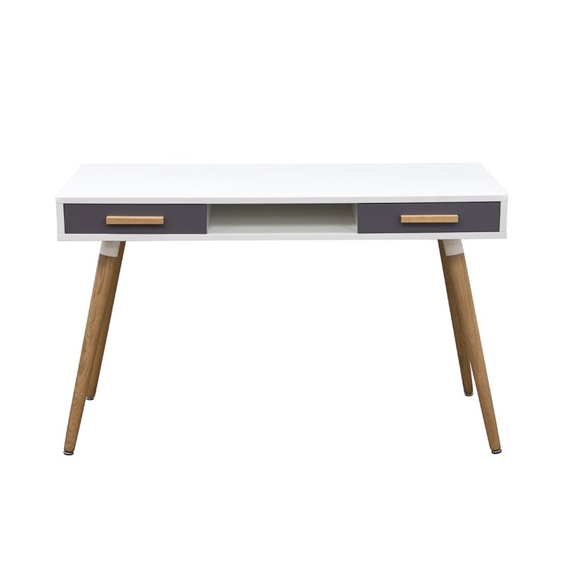 Great for a work station or decorative accent table throughout the home or office.Finish: White\/GrayMaterial: MDF\/OakContrasting Gray Drawer Fronts with Oak KnobsGreat piece for Work Station or Accent Table Flared Solid Oak LegsUp to 1 Year WarrantySpecifications:Overall Product Dimensions: 30 H x 18 W x 47 DProduct Weight: 57 lbs