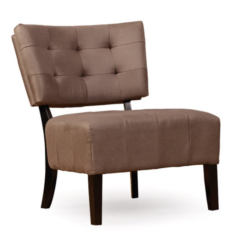 With its contoured, tufted backrest supported by wood supports and matching legs, the Olivia Chair offers a chic seating alternative to today's decorating direction.Finish: BrownMaterial: FabricFabric Cover in Milk Chocolate FinishContoured Seat Design for Maximum ComfortWood Leg and Back Support in Espresso FinishSleek, Contemporary DesignUp to 1 Year WarrantySpecifications:Overall Product Dimensions: 34 H x 30 W x 26 DProduct Weight: 23 lbs