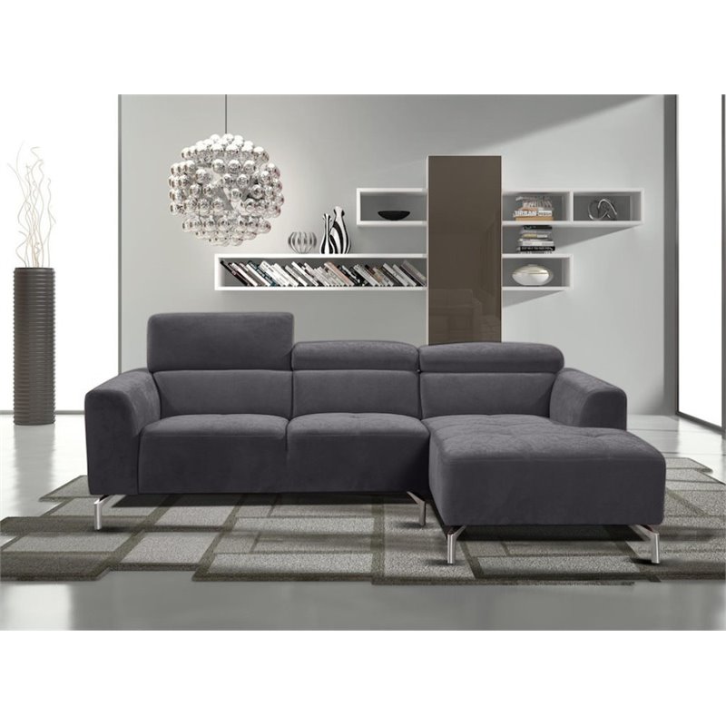 Overall 2PC Sectional dimensions are 90 inches by 57 inches by 28-36 inches.Finish: GrayMaterial: FabricGray Plush Polyester Fabric FinishAdjustable Tension HeadrestsStylish Metal LegUp to 1 Year WarrantySpecifications:Left Facing Sofa Dimensions: 28 H x 57 W x 36 DRight Facing Chaise Dimensions: 28 H x 57 W x 33 DSeat Height 17.5