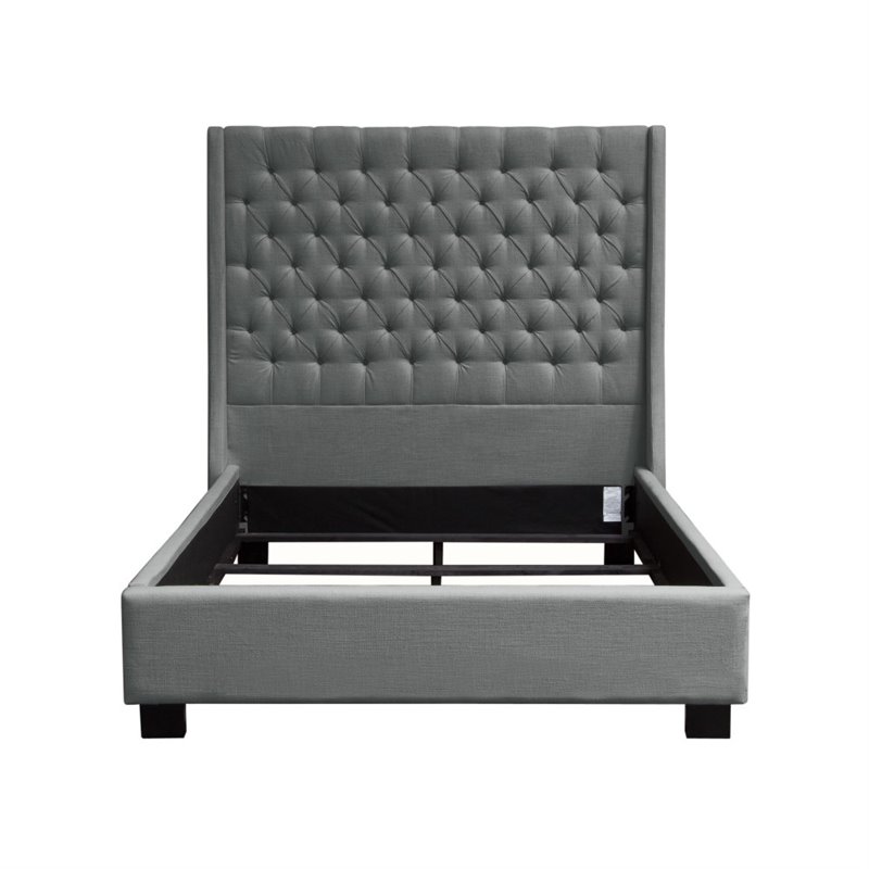 With its tufted headboard, vintage wing accents and wood feet finished in a rich medium walnut finish providing the backdrop for the Gray Linen finish - creating this timeless addition to any bedroom's decor