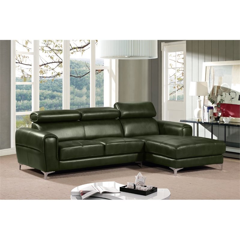 Finish: Forest GreenMaterial: LeatheretteSupple Leatherette in Forest Green FinishAdjustable Tension HeadrestsStylish Metal LegTufted Seat Design DetailUp to 1 Year WarrantySpecifications:Left Facing Sofa Dimensions: 30 H x 64 W x 34 DRight Facing Chaise Dimensions: 30 H x 63 W x 37 DLeft Facing Weight: 88 lbsRight Facing Chaise Weight: 81 lbsOverall Product Weight: 169 lbs