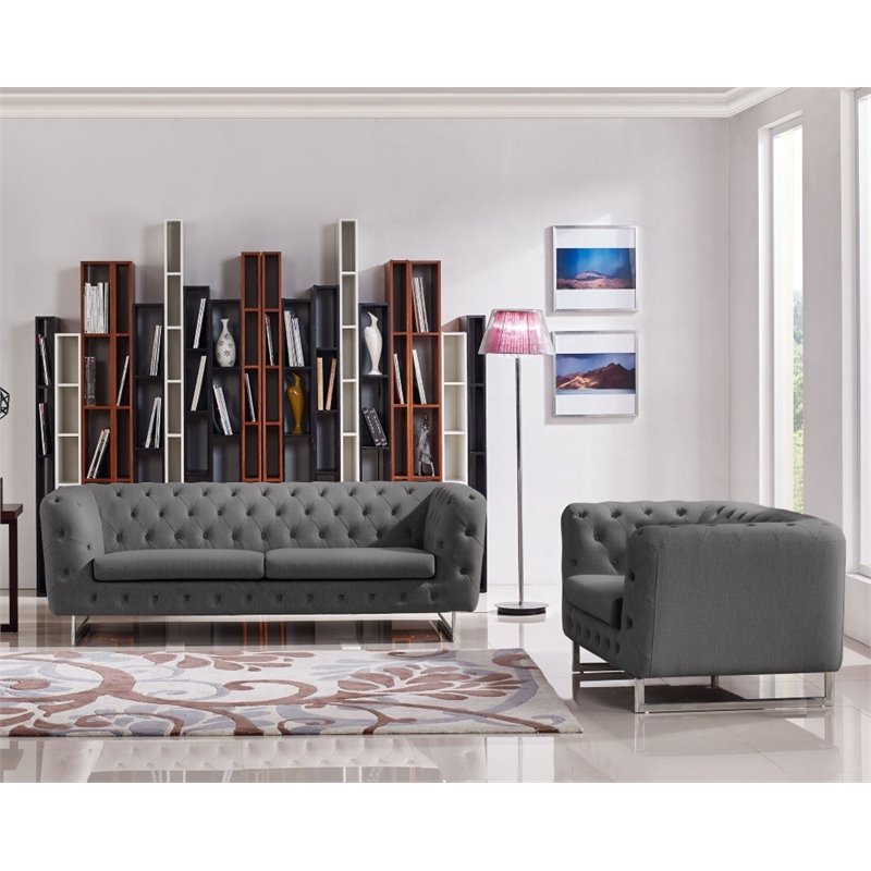 Chair, all pieces available in a Sand or Gray fabric.Finish: GrayMaterial: FabricGray Plush Polyester Fabric FinishTufted Design with Rolled Arm StylingUp to 1 Year WarrantySpecifications:Sofa Dimensions: 29 H x 86 W x 35 DChair Dimensions: 29 H x 44 W x 35 DSofa Weight: 114 lbsChair Weight: 62 lbs