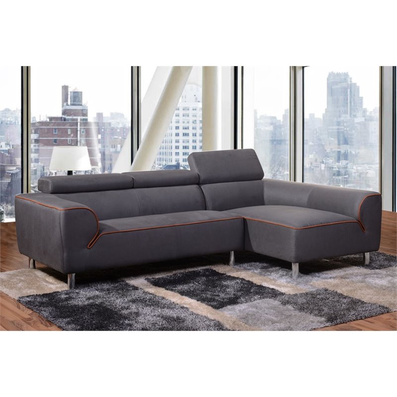 Overall 2PC Sectional dimensions are 94 inches by 59 inches by 28-36 inches.Finish: GrayMaterial: FabricGray Plush Polyester Fabric Finish with Contrasting Orange WeltThree Adjustable Tension HeadrestsStylish Metal LegUp to 1 Year WarrantySpecifications:Left Facing Sofa Dimensions: 28 H x 59 W x 37 DRight Facing Chaise Dimensions: 28 H x 59 W x 35 DSeat Height 17.5