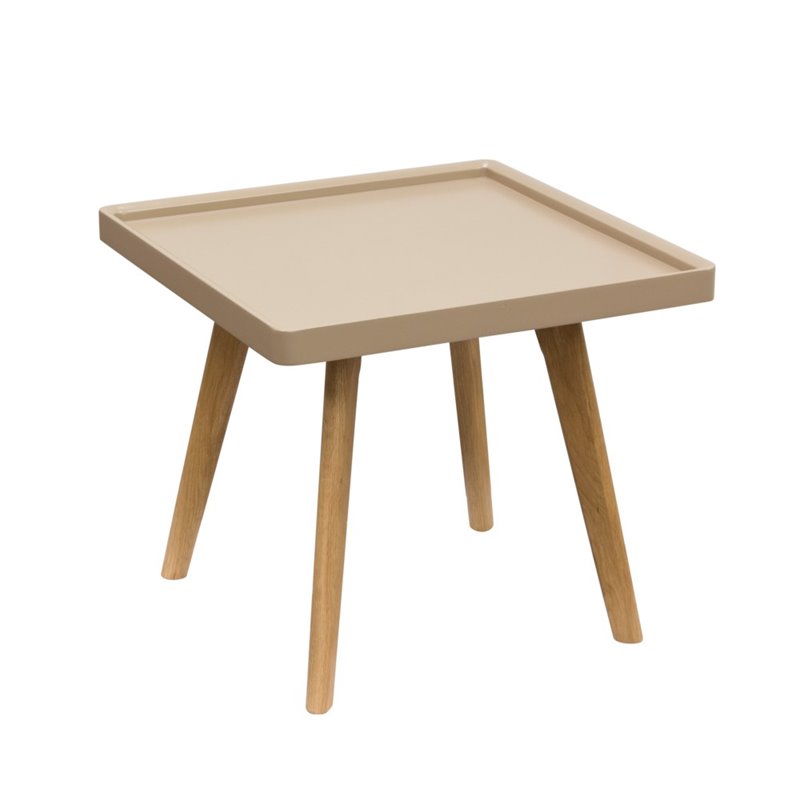 Matching and contrasting cocktail table is also available.Finish: Taupe\/OakMaterial: MDFMDF Top with Matte Taupe Lacquer FinishSolid Oak LegsLipped Edge Design DetailGreat Accent Table for Any Room's DecorUp to 1 Year WarrantySpecifications:Overall Product Dimensions: 17 H x 19 W x 19 DProduct Weight: 18 lbs