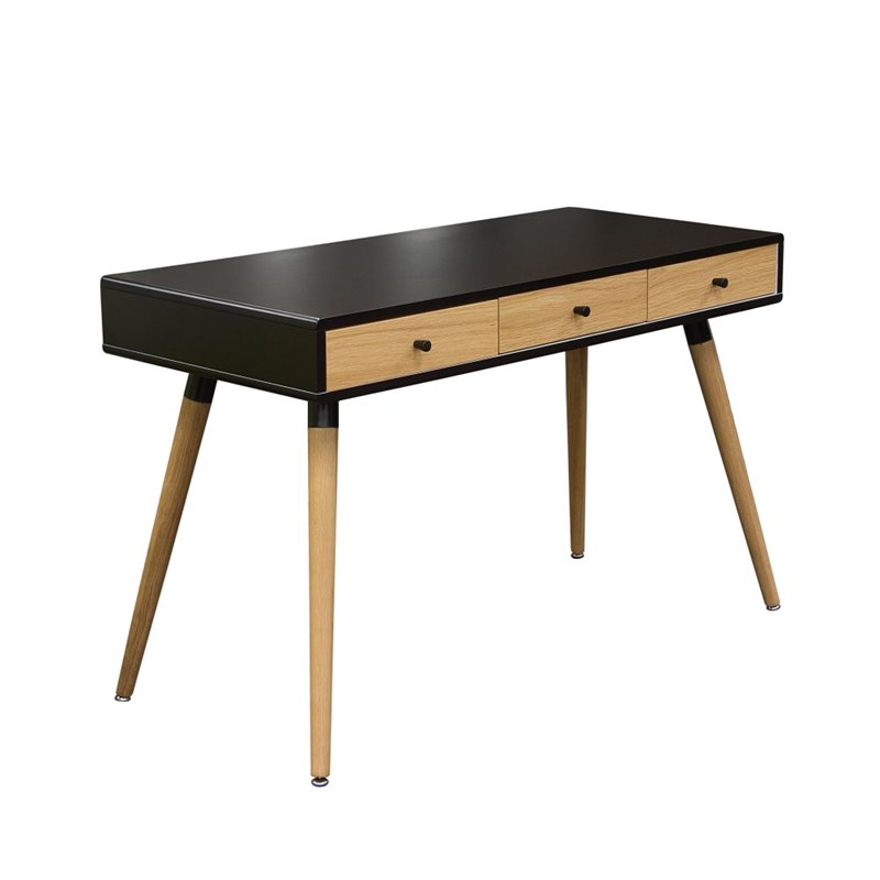 Great for a work station or decorative accent table throughout the home or office.Finish: Black\/OakMaterial: MDF\/OakContrasting Oak Drawer Fronts with Black KnobsGreat piece for Work Station or Accent Table Flared Solid Oak LegsUp to 1 Year WarrantySpecifications:Overall Product Dimensions: 30 H x 22 W x 47 DProduct Weight: 87 lbs