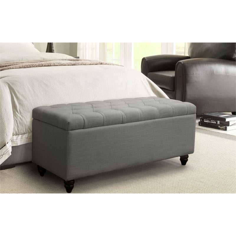 Made with a sturdy hardwood construction, covered and tufted in a Gray Linen fabric with dual tension hinge on the lift-top
