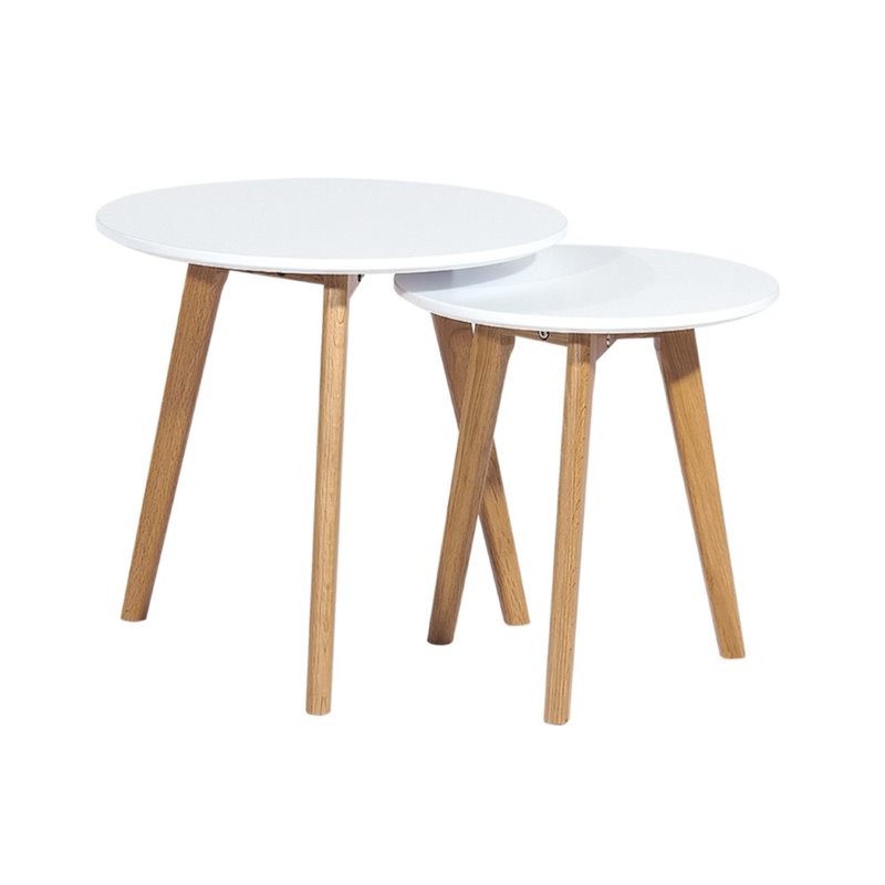 Small table is 16 Inches by 16 Inches by 16 InchesFinish: OakMaterial: OakSolid Oak Legs in Natural FinishMarble Like Finish Table Tops2-Pack Nesting TablesUp to 1 Year WarrantySpecifications:Large Size: 18 H x 20 W x 20 DSmall Size: 16 H x 16 W x 16 DProduct Weight: 17 lbs