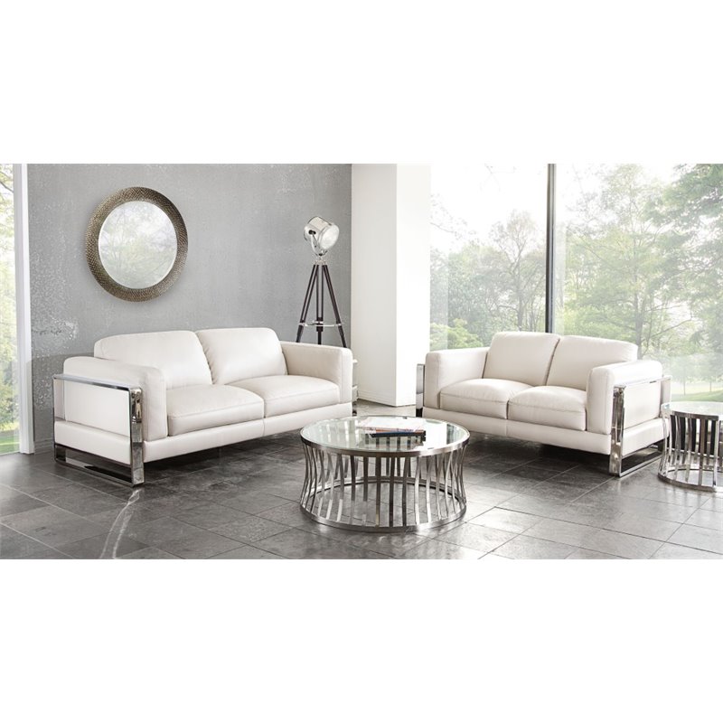 Finish: BoneMaterial: PUBone Leatherette FinishPolished Stainless Steel ArmCrisp, Clean Streamlined Design for Modern LivingUp to 1 Year WarrantySpecifications:Sofa Dimensions: 33 H x 82 W x 39 DLoveseatDimensions: 33 H x 66 W x 39 DSofa Weight: 199 lbsLoveseat Weight: 126 lbs