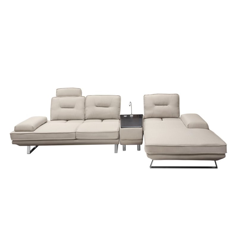 Right Face Chaise with Multi-Media Console featuring: Integrated Phone Connectivity, USB, Bluetooth, Built-In Sound System, Storage and Touch LED Lamp.Finish: SandMaterial: FabricSand Plush Polyester Fabric FinishAdjustable Back Rests for Seating Depth CustomizationMultimedia Console includes: Storage, Speaker, Bluetooth, LED Touch Lamp, USB, Phone ConnectivitySpecifications:Chaise Sectional Dimension: 24H x 59W x 116DConsole Dimnesion: 19H x 42W x 19DProduct Weight: 359 lbsSeat Height: 17