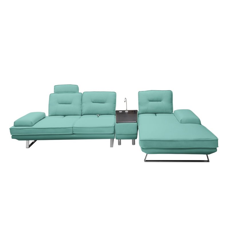 Right Face Chaise with Multi-Media Console featuring: Integrated Phone Connectivity, USB, Bluetooth, Built-In Sound System, Storage and Touch LED Lamp.Finish: SeafoamMaterial: FabricSeafoam Plush Polyester Fabric FinishAdjustable Back Rests for Seating Depth CustomizationMultimedia Console includes: Storage, Speaker, Bluetooth, LED Touch Lamp, USB, Phone ConnectivitySpecifications:Chaise Sectional Dimension: 24H x 59W x 116DConsole Dimnesion: 19H x 42W x 19DProduct Weight: 359 lbsSeat Height: 17