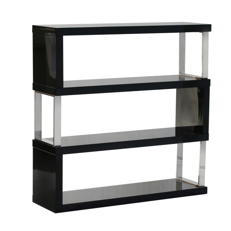 Finished in a High Gloss Black Lacquer with Brushed Stainless Steel Supports, it provides an edge to the piece to accent any room's decor.Finish: Black LacquerMaterial: MDF w\/ LacquerBrushed Stainless Steel SupportsModular Design allows for multiple items to create dividerHigh Gloss Black Lacquer FinishAlternating Shelf PatternUnique &