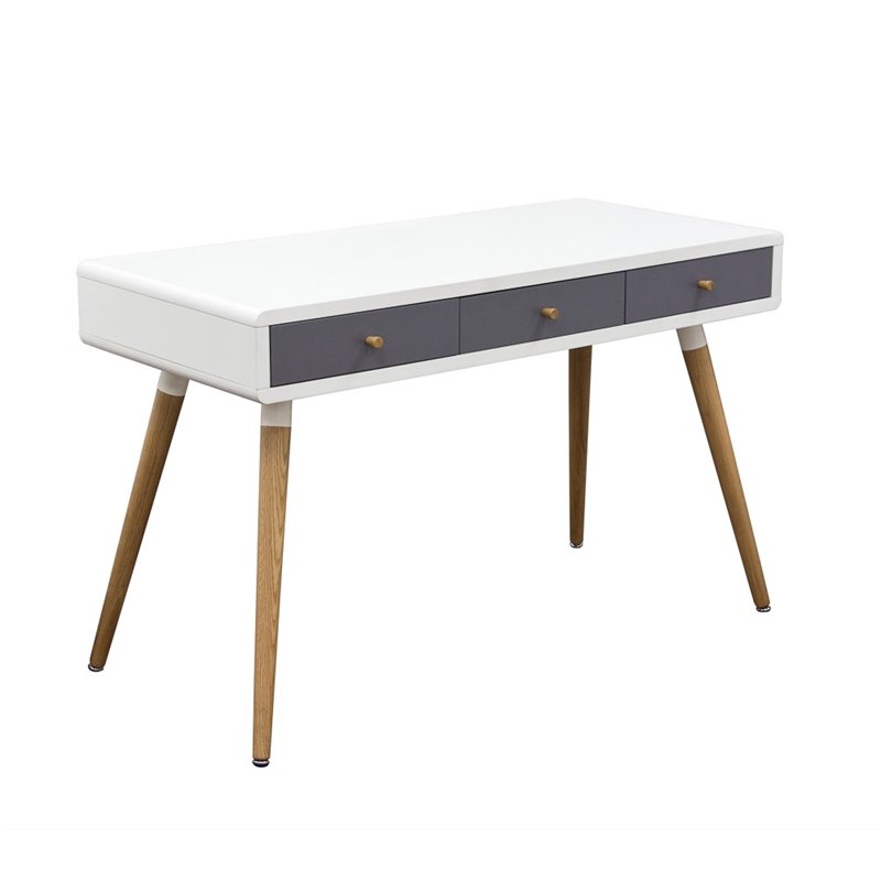 Great for a work station or decorative accent table throughout the home or office.Finish: White\/GrayMaterial: MDF\/OakContrasting Gray Drawer Fronts with Oak KnobsGreat piece for Work Station or Accent Table Flared Solid Oak LegsUp to 1 Year WarrantySpecifications:Overall Product Dimensions: 30 H x 22 W x 47 DProduct Weight: 87 lbs